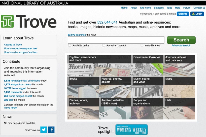 In the same way that many people enjoy spending time doing crosswords, ‘sudokuing’, or playing a favourite computer game I just love to spend time on Trove. It is a free search engine created by the National Library of Australia and launched as Trove in November 2009. http://trove.nla.gov.au/ “Trove takes users straight to the source – not just to a list of websites – and allows them to search across pictures, unpublished manuscripts, books, oral histories, music, videos, research papers, diaries, letters, maps, archived websites and Australian newspapers from 1803 to 1954.” https://www.nla.gov.au/media-releases/trove-a-revolutionary-new-free-search-engine