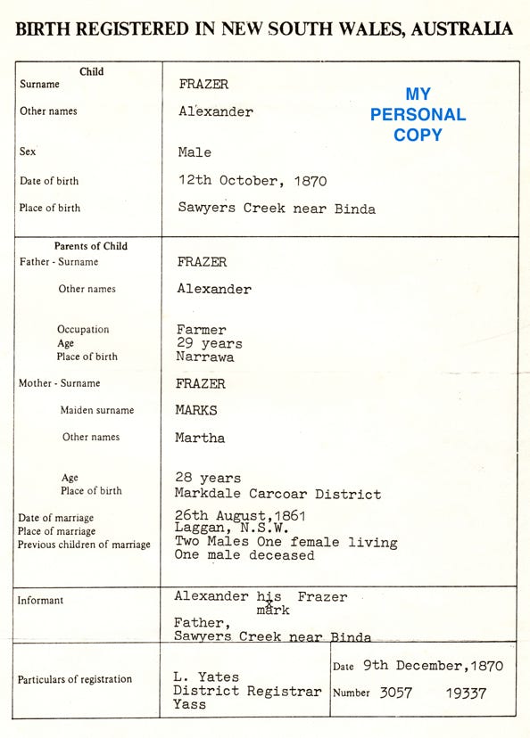 In the late 1980’s a phone enquiry I made to a local history group in the Binda region resulted in my being mailed a photocopied page on The Frasers. [See below.] I later learnt that the page was from a booklet that was out of print at that time:The Binda Connection: Stories of Four Families by Douglas Branson Webster (1985).