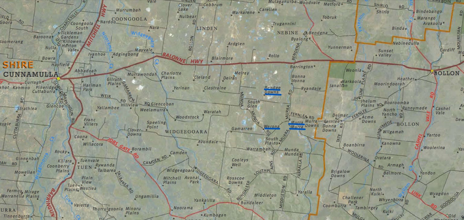 Bendee Downs is located 630 kilometres West of Brisbane. The site has limited facilities, including the shearing shed, shearer’s accommodation, shower and toilet block, generator room and airstrip – none of which are currently in use. Bendee Downs is bordered by several small homesteads, with South Glenn, Bonna Vonna, Melray, Werona, Rollo, Ryandale, Deiran and Gamarren all within 25km.” (p. 26)